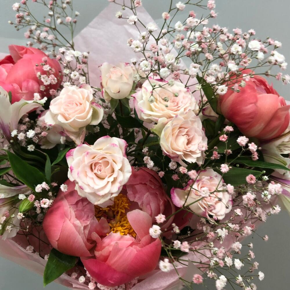 Пион – 3 шт.Роза кустовая – 1 шт.Альстромерия – 2 шт.гипсофтла – 1 шт.Тишью – 1 шт.Пленка дизайнерская – 1 шт.Лента атласная – 1 шт.