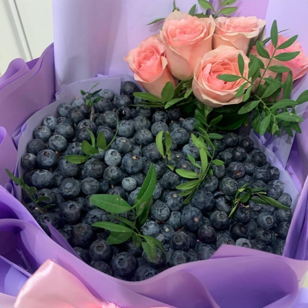 Голубика – 600 гр.Фисташка пучок – 1 шт.Дизайнерская упаковка – 1 шт.розы эквадор (60 см) – 5 шт.