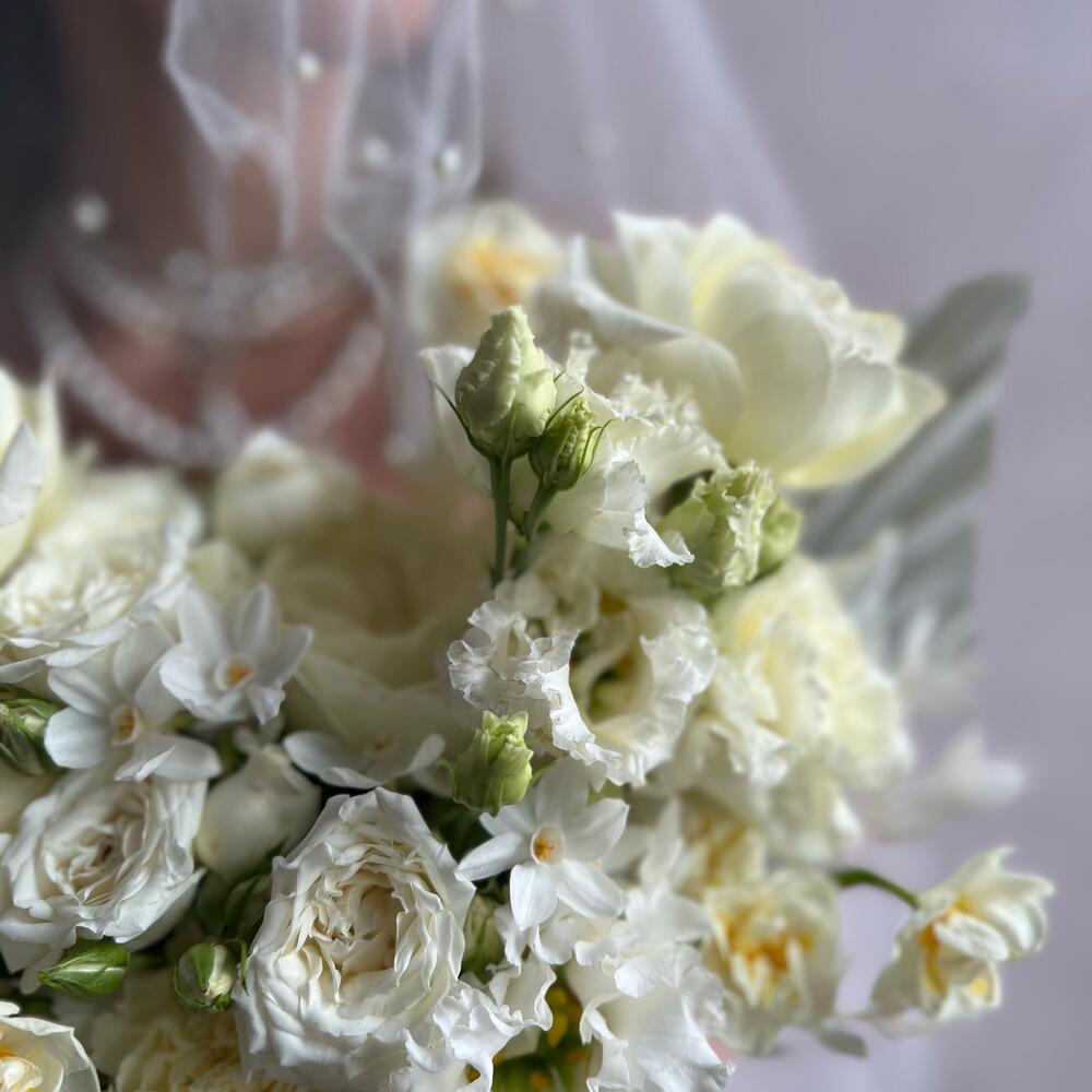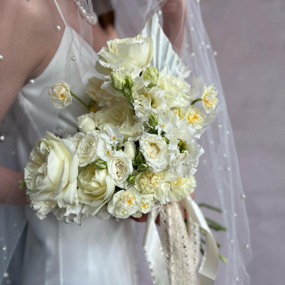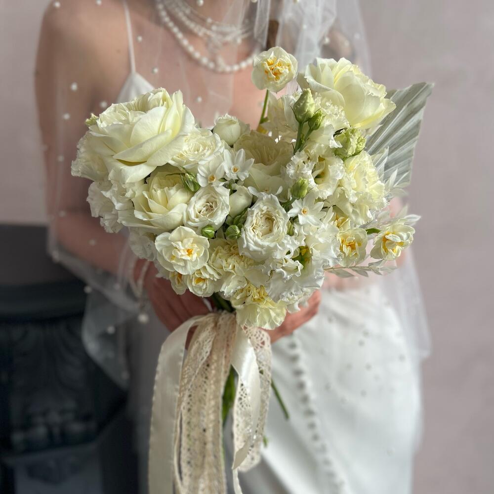 Лизиантус – 3 шт.Нарцисс – 9 шт.Диантус – 5 шт.Пионовидная роза – 5 шт.Атласная лента – 1 шт.Кустовая пионовидная роза – 5 шт.пальмовое копье – 1 шт.