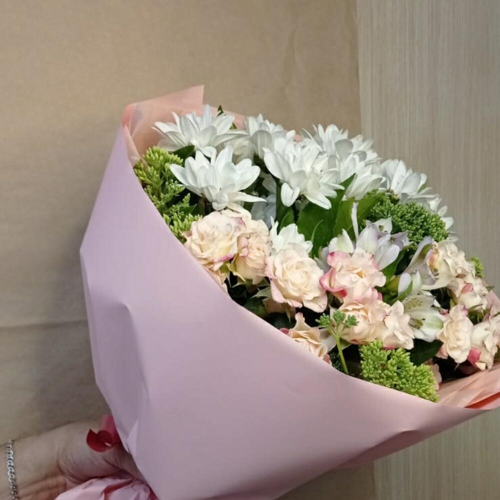 Роза кустовая – 3 шт. Хризантема кустовая – 2 шт. Альстромерия Микс Европа – 1 шт.