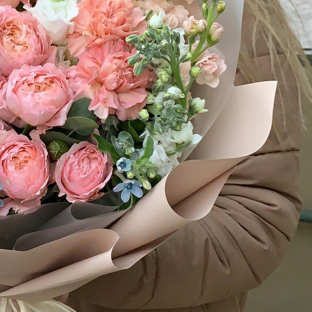Роза пионовидная кустовая – 3 шт.Оксипеталум – 2 шт.Маттиола – 7 шт.Диантус – 5 шт.Лизиантус – 1 шт.Упаковка – 2 шт.Лента – 2 шт.