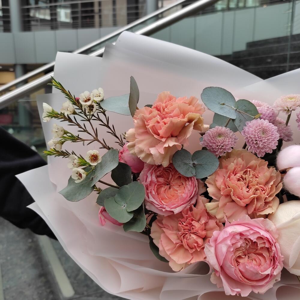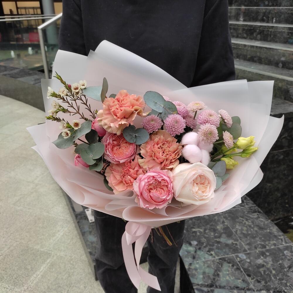 Роза кустовая пионовидная – 1 шт.Эвкалипт – 3 шт.Хризантема кустовая – 2 шт.Диантус – 3 шт.Хлопок – 1 шт.Роза пионовидная – 1 шт.Хамелациум – 1 шт.Упаковка – 2 шт.Лента – 2 шт.