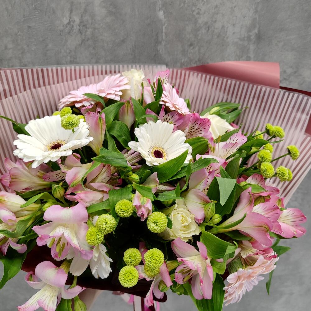 Альстромерия – 7 шт.Гербера – 6 шт.Роза – 3 шт.хризантема кустовая помпон – 3 шт.Авторская упаковка – 1 шт.Атласная лента – 1 шт.