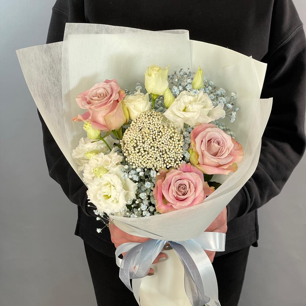 Гипсофила – 1 шт.Лента – 2 шт.Лизиантус – 2 шт.Озотамнус – 1 шт.Роза – 3 шт.Упаковка – 1 шт.