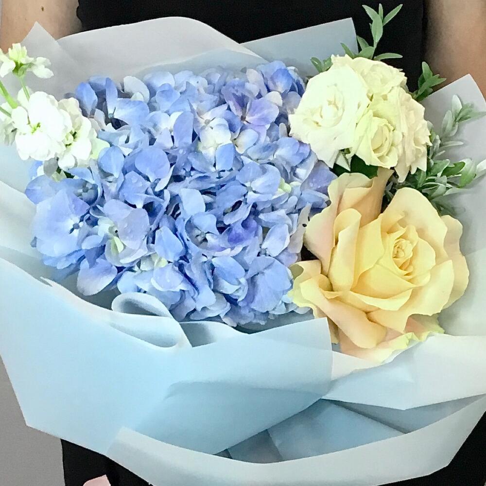 Маттиола – 1 шт.Кустовая роза – 1 шт.Лента атласная – 1 шт.Фисташка – 2 шт.Гортензия голубая – 1 шт.роза шарман – 1 шт.