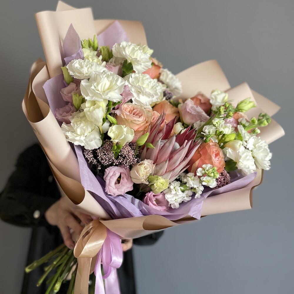 Маттиола – 3 шт.Озотамнус – 5 шт.Протея – 1 шт.Фрезия – 10 шт.Роза – 7 шт.Гвоздика – 11 шт.Эустома – 2 шт.Фисташка – 4 шт.