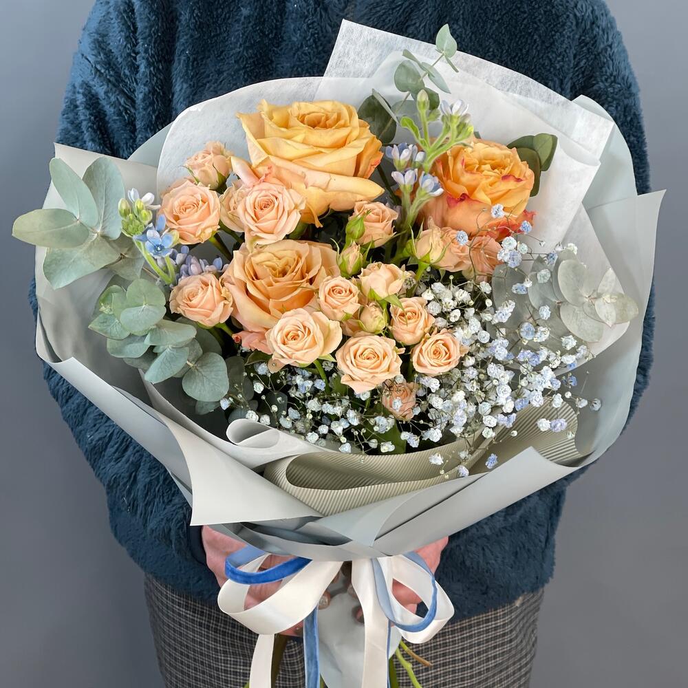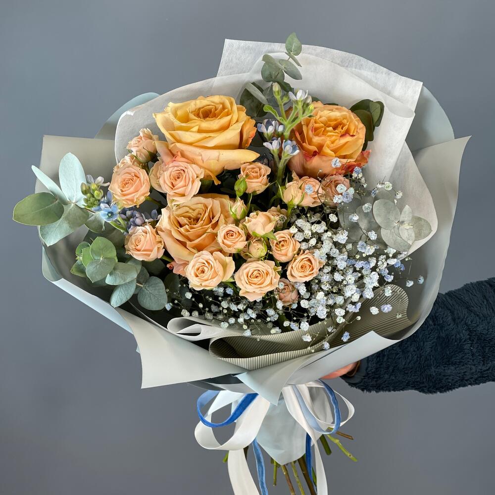 Гипсофила – 1 шт.Лента – 1 шт.Роза кустовая – 2 шт.Эвкалипт – 1 шт.Роза одноголовая – 3 шт.Оксипеталум – 2 шт.Упаковка дизайнерская – 1 шт.