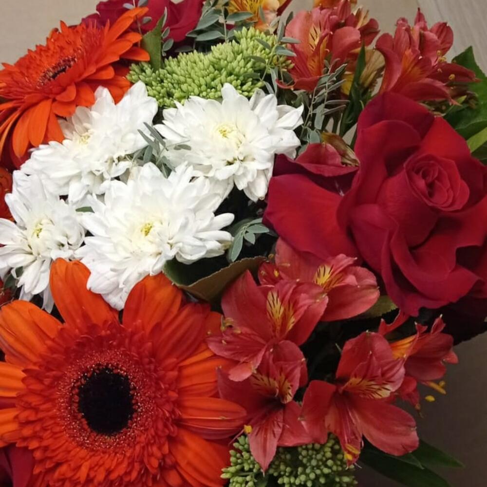 Альстромерия – 5 шт. Роза красная – 3 шт. Хризантема кустовая белая – 1 шт. Гербера красная – 3 шт.