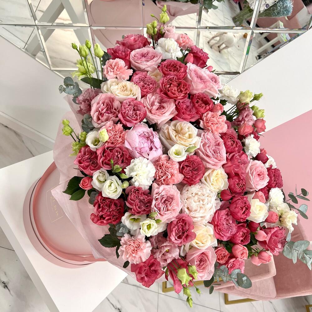 Роза пионовидная – 39 шт.Лизиантус – 12 шт.Пион – 4 шт.Диантус – 9 шт.Кустовая роза – 12 шт.Эвкалипт – 5 шт.Шляпная коробка – 1 шт.