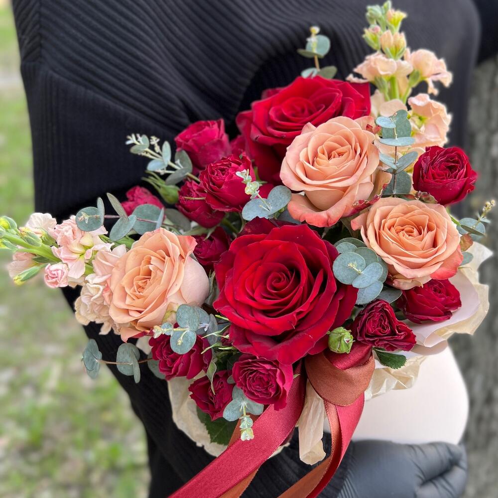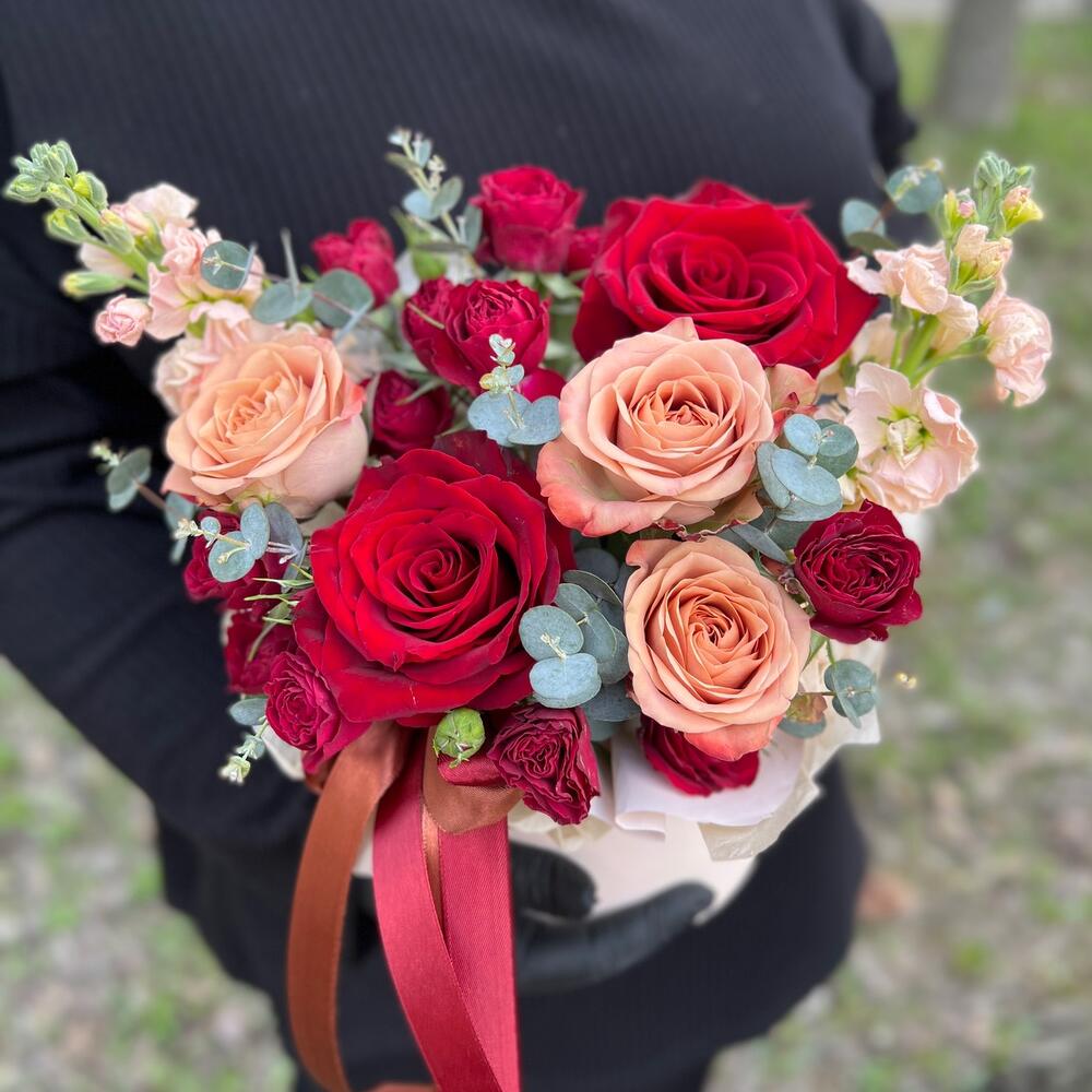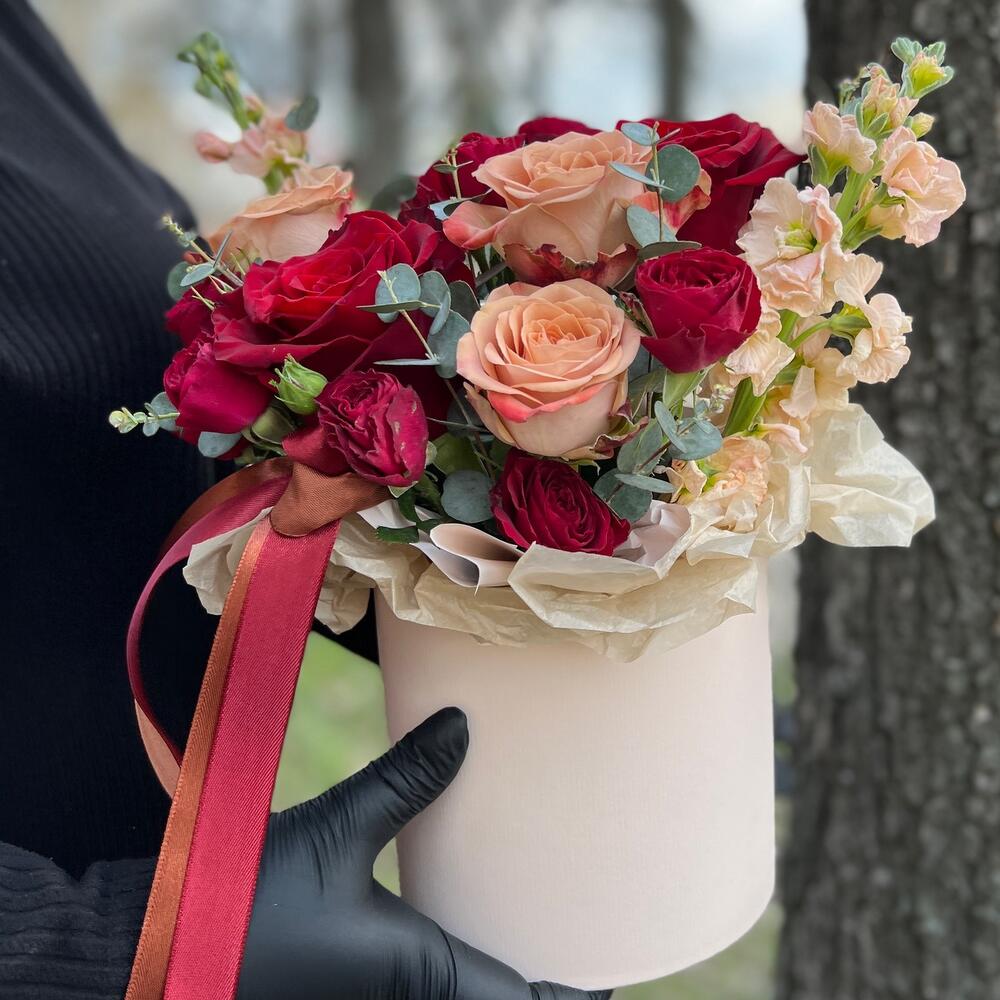 Маттиола – 2 шт.Роза Капучино – 3 шт.Эвкалипт – 3 шт.Лента атласная – 2 шт.Коробка шляпная – 1 шт.Роза Эксплорер – 3 шт.Оазис флористический – 1 шт.роза кустовая пионовидная ред трендсеттер – 2 шт.