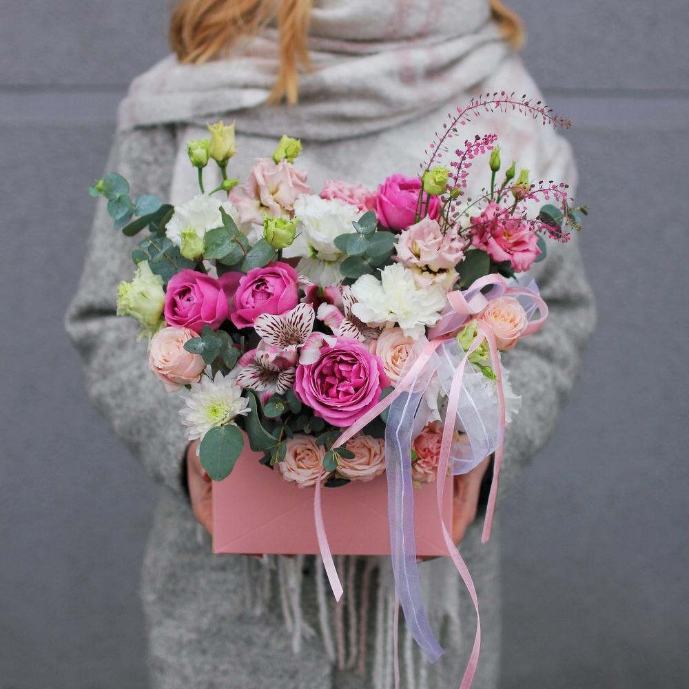 Нежная цветочная композиция в крафтовом конверте. Цветы расположены во влажной флористической губке и не требуют вазы с водой.