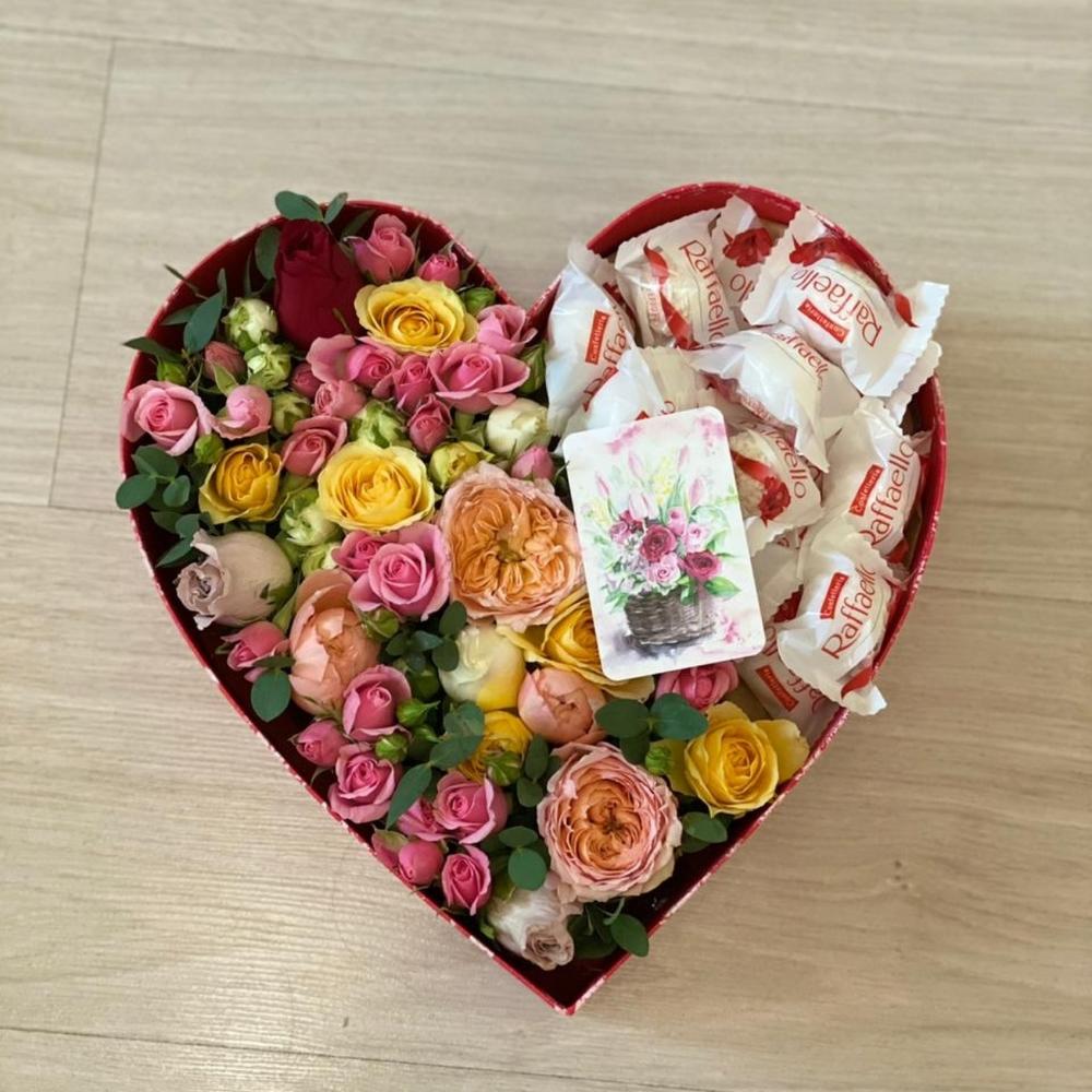 Коробка в виде сердца с миксом из роз и конфетами рафаэлло