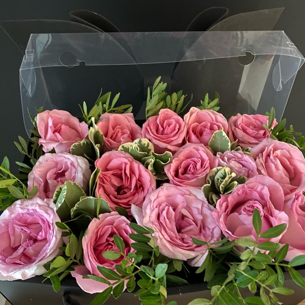 Питтоспорум – 2 шт. Роза Эквадор – 15 шт. писташка зелень – 2 шт. коробка с бантом черная – 1 шт.