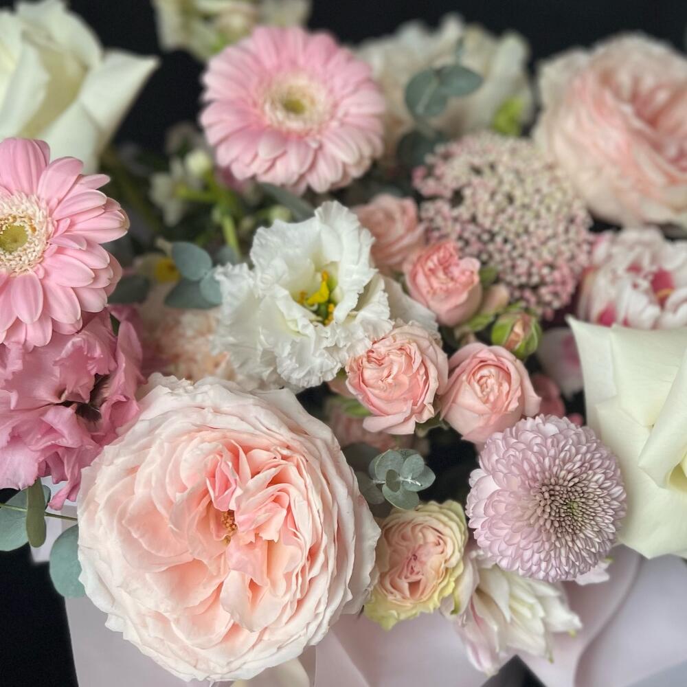 Цветы в коробке из пионовидных роз,Хризантемы и Гербер