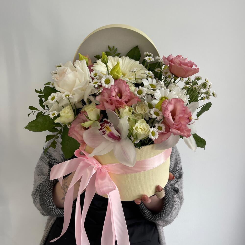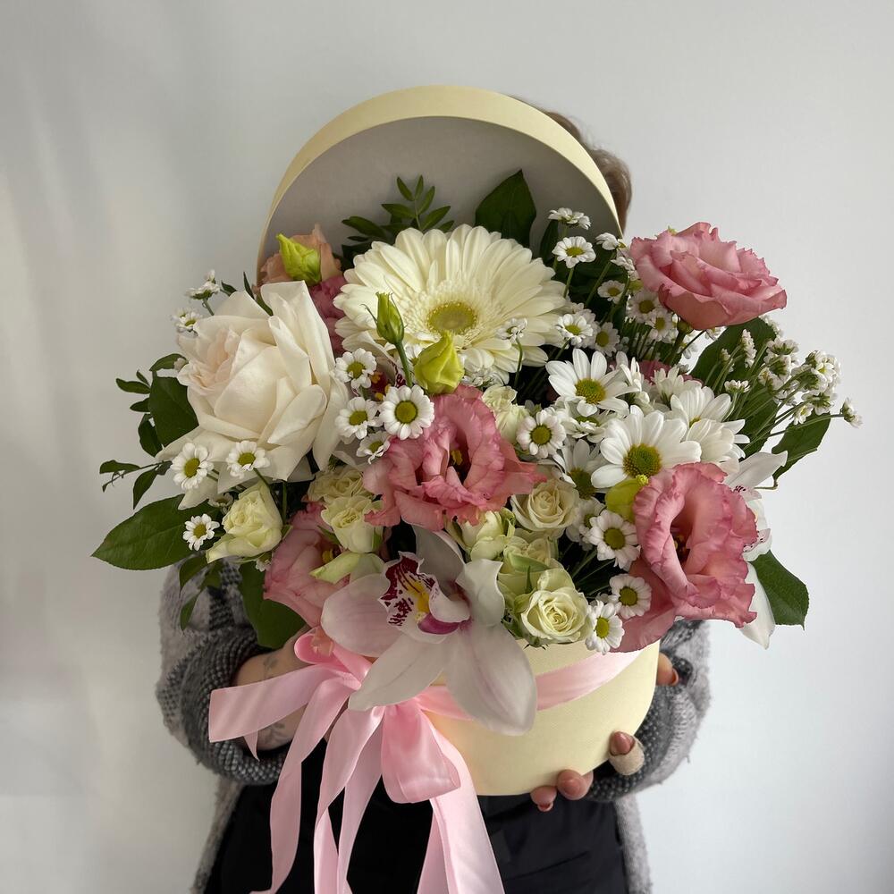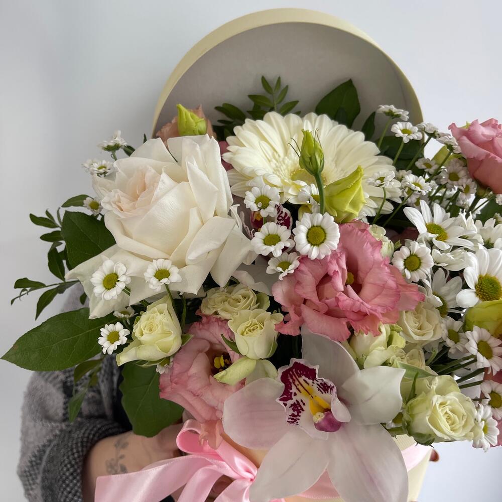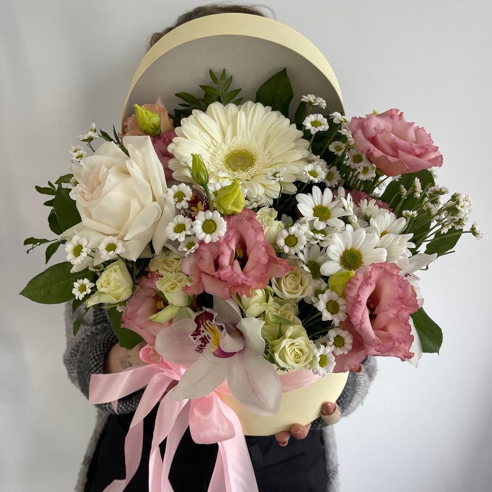 Гербера – 1 шт.Охара – 1 шт.Эустома – 1 шт.Сантини – 3 шт.Хризантема кустовая – 1 шт.Роза кустовая – 2 шт.Орхидея Цимбидиум – 1 шт.Коробка шляпная – 1 шт.Оазис флористический – 1 шт.Салал пучок – 1 шт.
