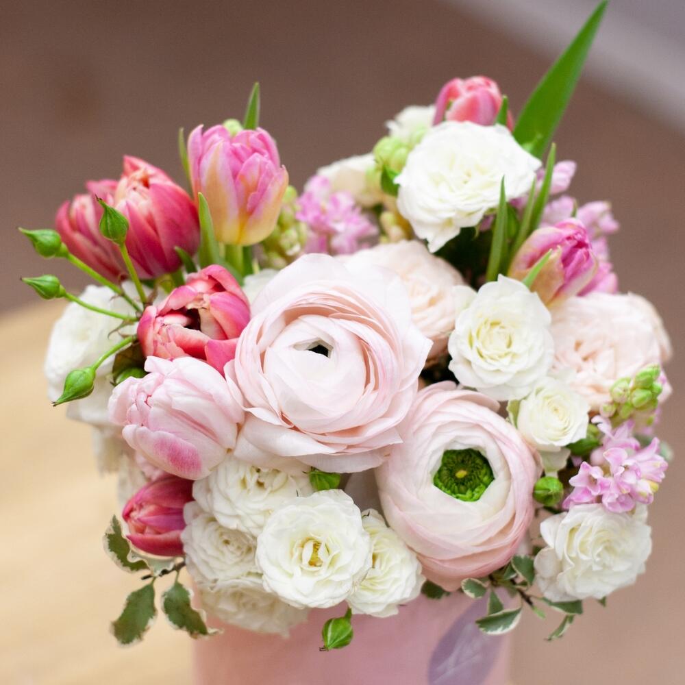 Нежная композиция с розовыми лютиками в шляпной коробке ❤️
