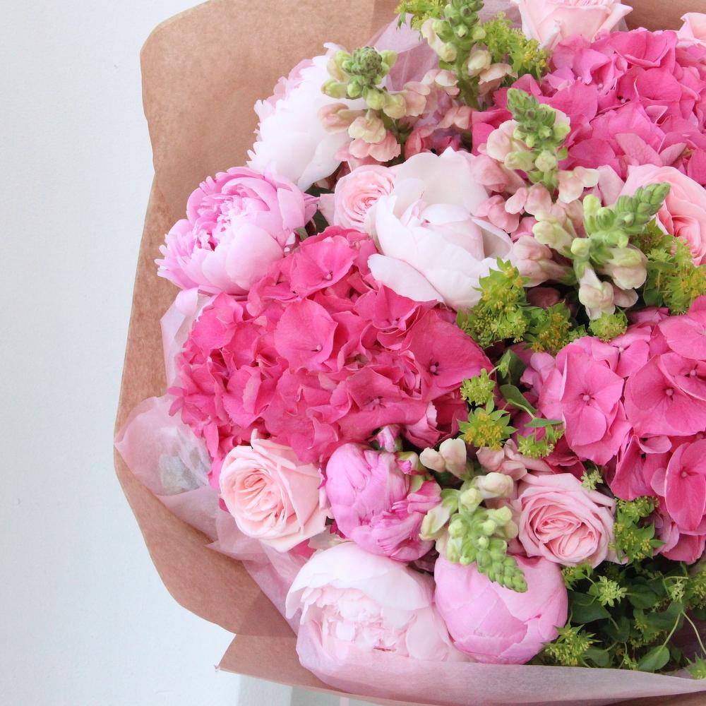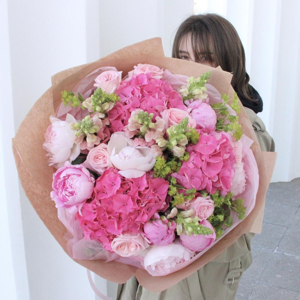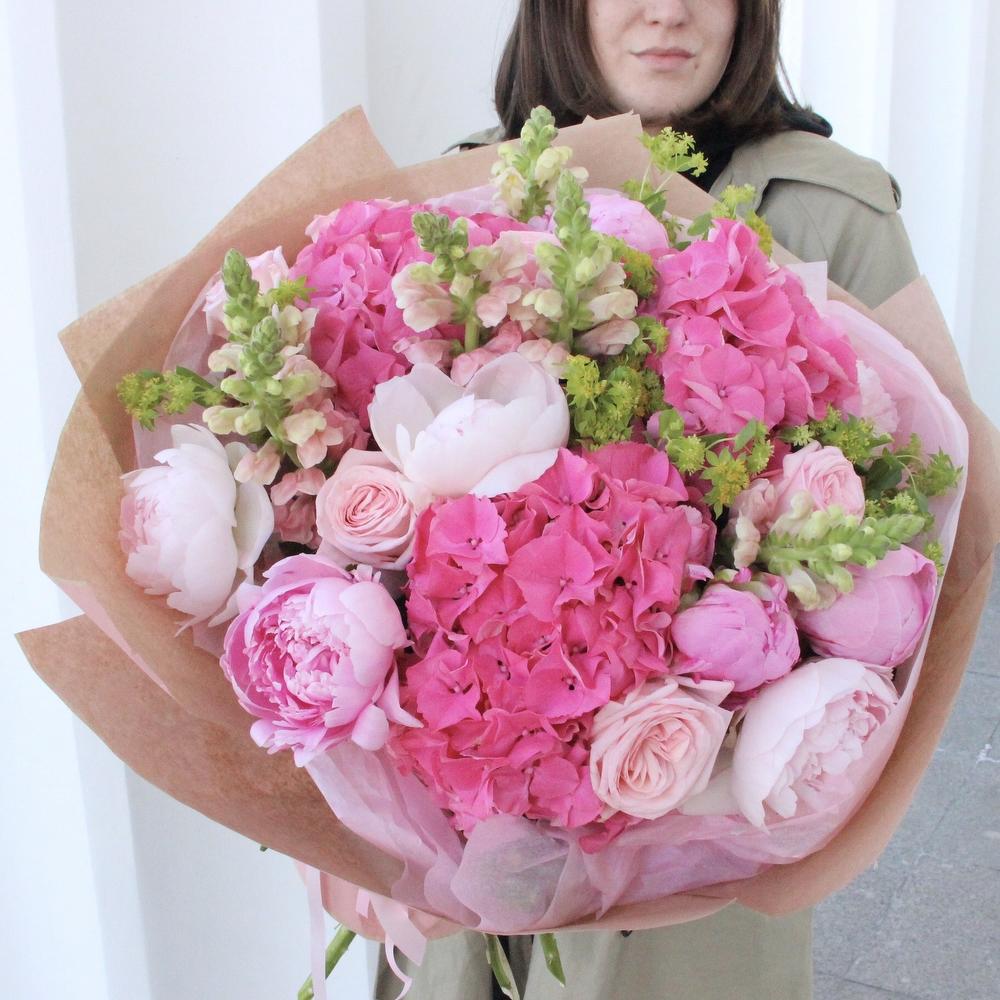 Розовый букет с гортензиями, пионами, львиным зевом, пионовидными розами и садовой зеленью в лаконичной упаковке.