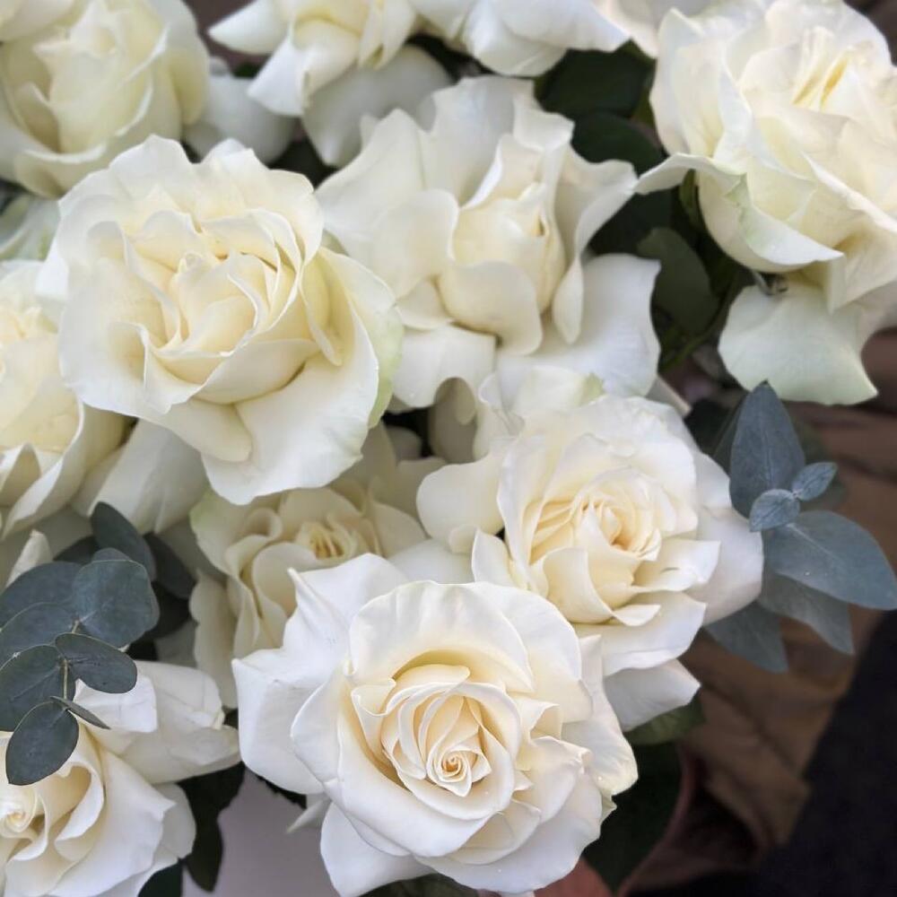 Нежнейшая композиция из французских жемчужных роз с ароматным эвкалиптом в коробке. Цвет коробки в ассортименте. Особая техника обработки делает бутон больше обычного. Стойкость таких бутонов, как у садовой пионовидной розы 3-5 дней.
