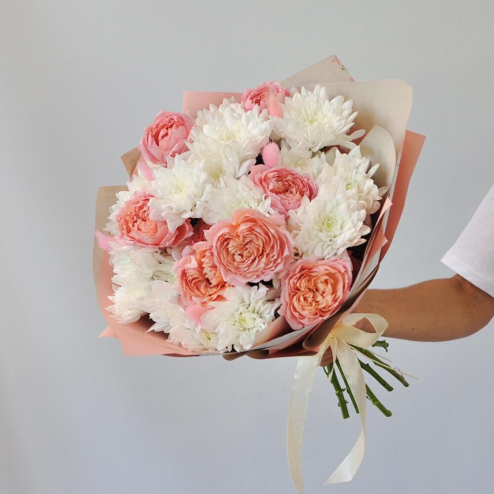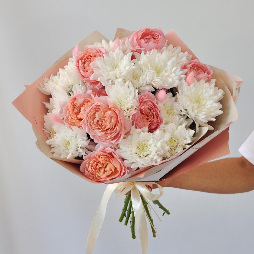 Хризантема и розы Джульетта в нежном букете