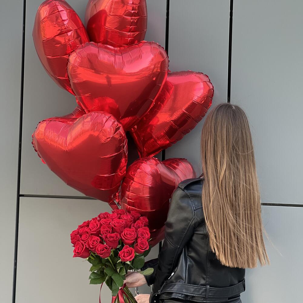 Комбо из букета из 25 красных роз и сета шаров (фольгированные сердца 7 шт.)