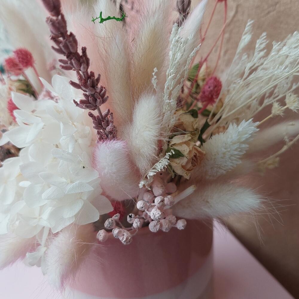 Стабилизированная гортензия – 1 шт.Лагурус (сухоцвет) – 22 шт.эрингиум розовый – 2 шт.лаванда розовая – 4 шт.Фаларис – 3 шт.Роза сухоцвет – 3 шт.Ягоды декоративные – 4 шт.гипсофила сухоцвет – 1 шт.пушистики – 5 шт.Оазис для сухоцветов – 1 шт.керомическое кашпо – 1 шт.