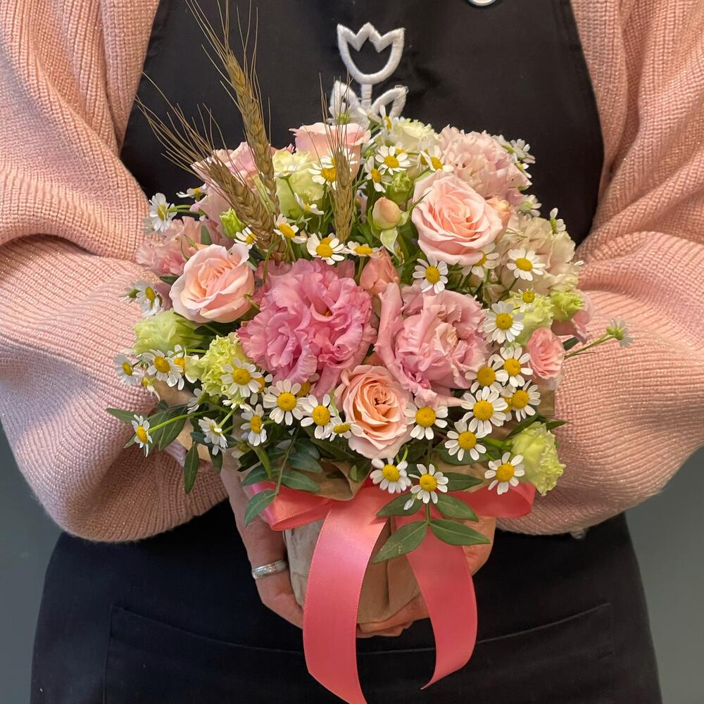 Лизиантус – 2 шт.Роза кустовая – 1 шт.Матрикария – 2 шт.Фисташка – 1 шт.Колоски – 3 шт.Упаковка дизайнерская – 1 шт.Оазис флористический – 1 шт.