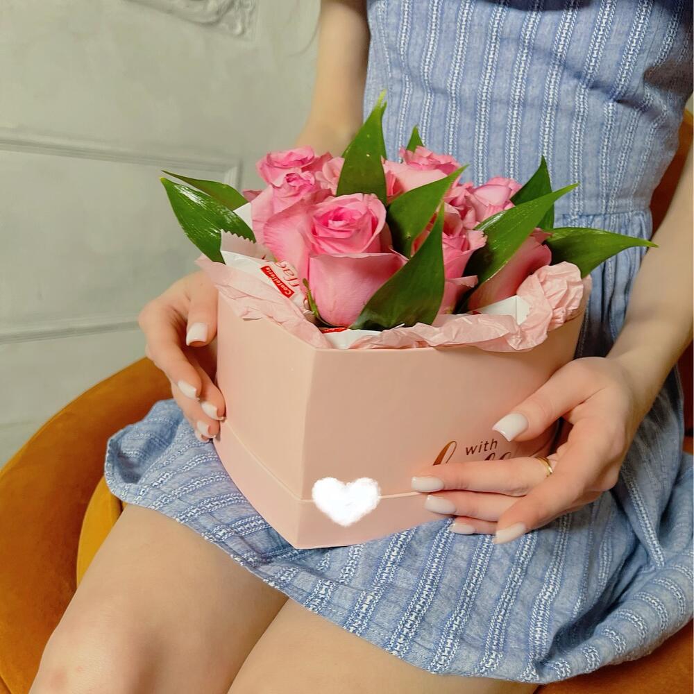 “Сладкое сердце ” – цветочная композиция с сладостями в коробке “Сердце”
