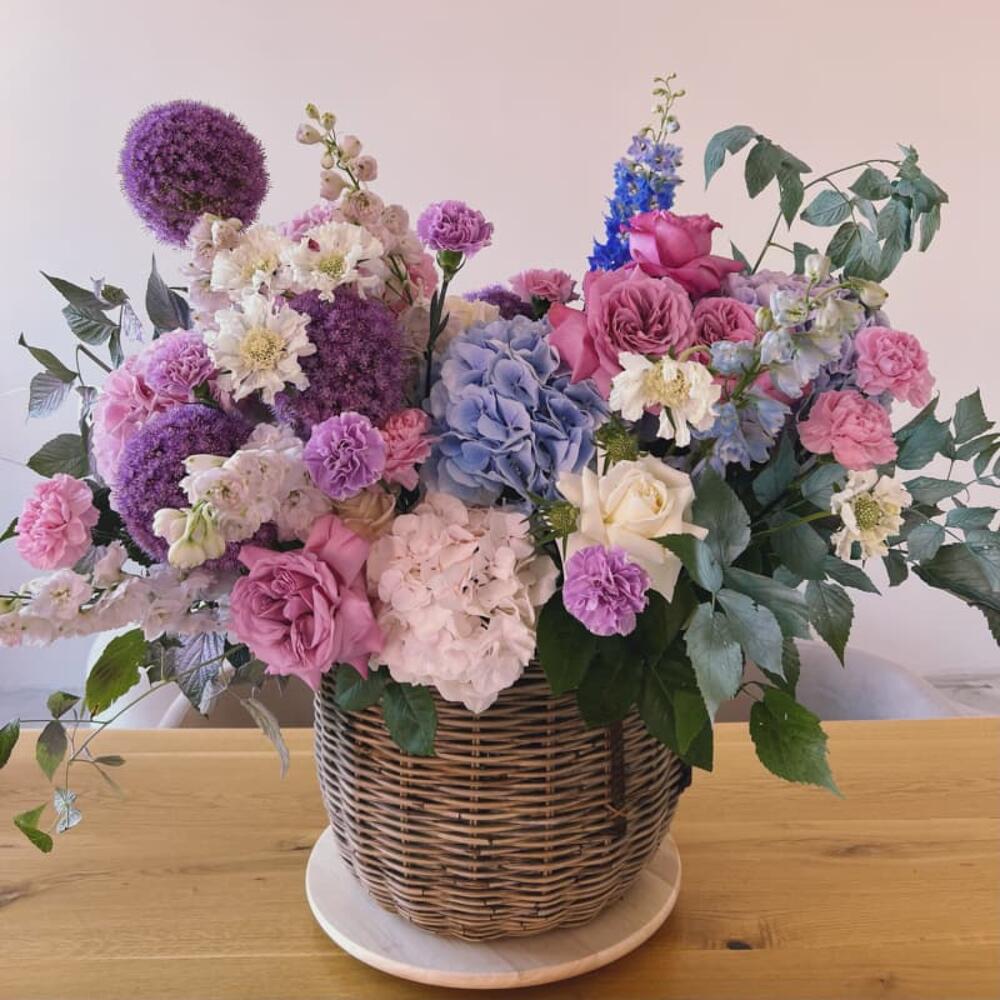 Гортензия – 5 шт.Аллиум – 3 шт.Дельфиниум – 3 шт.Пионовидная роза – 15 шт.Лунная гвоздика – 15 шт.