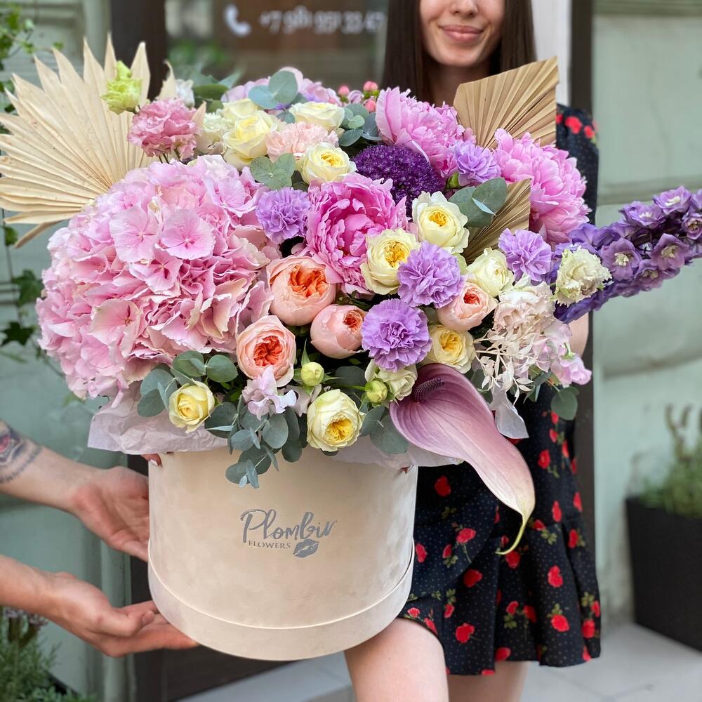 Гортензия – 1 шт.Коробка шляпная – 1 шт.Оазис флористический – 2 шт.Пион – 3 шт.Роза – 5 шт.Роза кустовая – 5 шт.Эустома – 5 шт.Зелень – 5 шт.Сухоцветы – 5 шт.