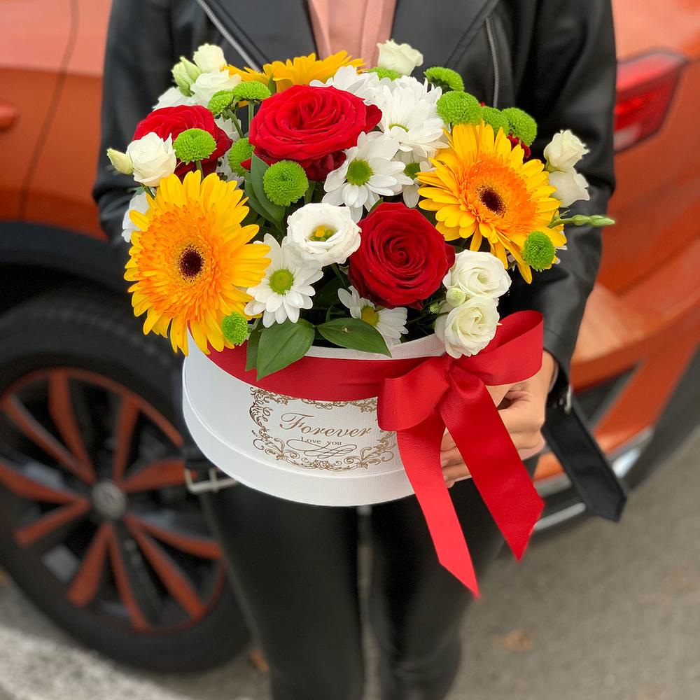 Роза красная – 3 шт. Коробка шляпная – 1 шт. Хризантема зеленая – 2 шт. Гербера желтая – 3 шт. Хризантема белая – 1 шт. эустома белая – 2 шт.
