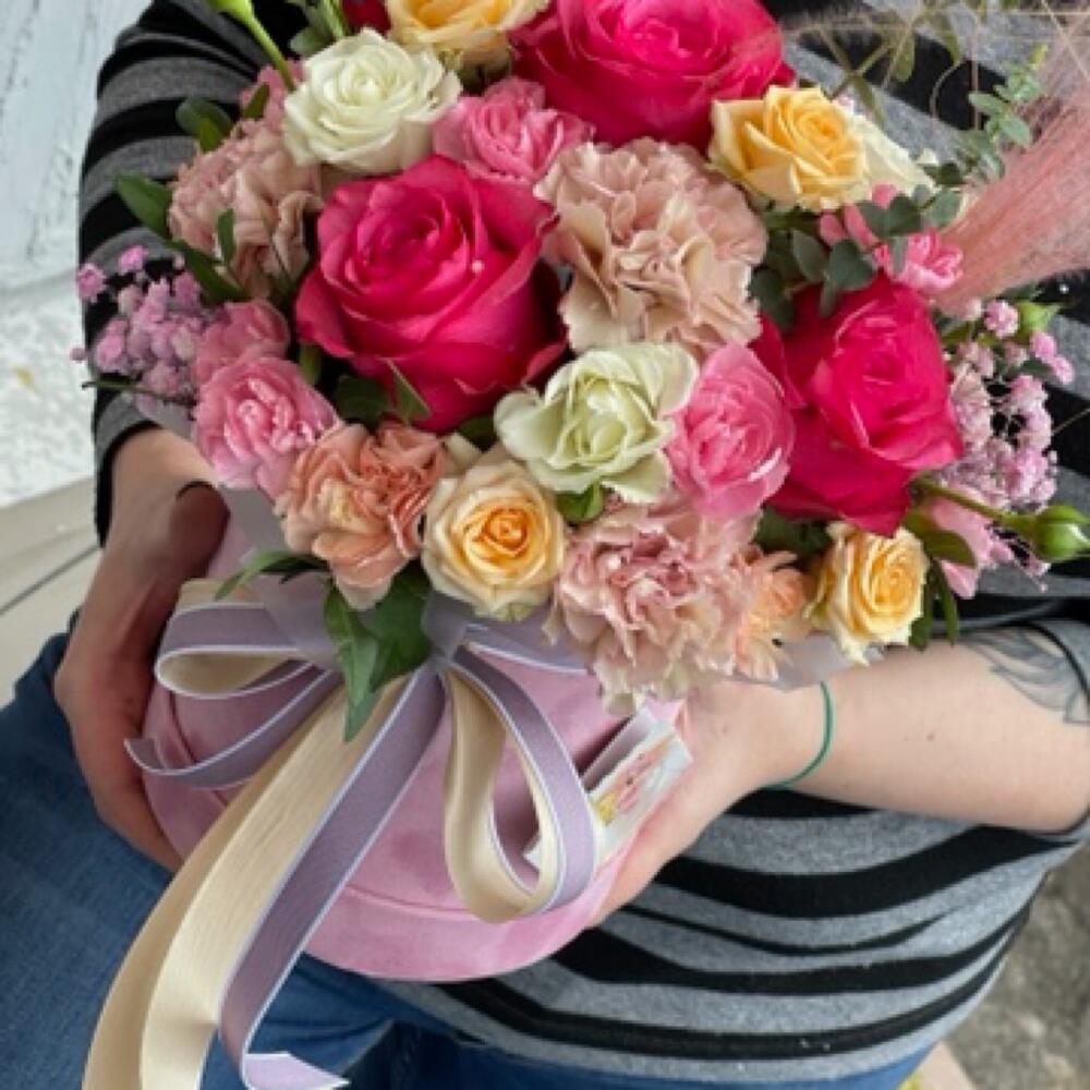 Круглая коробка шляпная с живыми цветами, в составе могут быть розы, гвоздики, хризантемы или любые , указанные вами акценты.