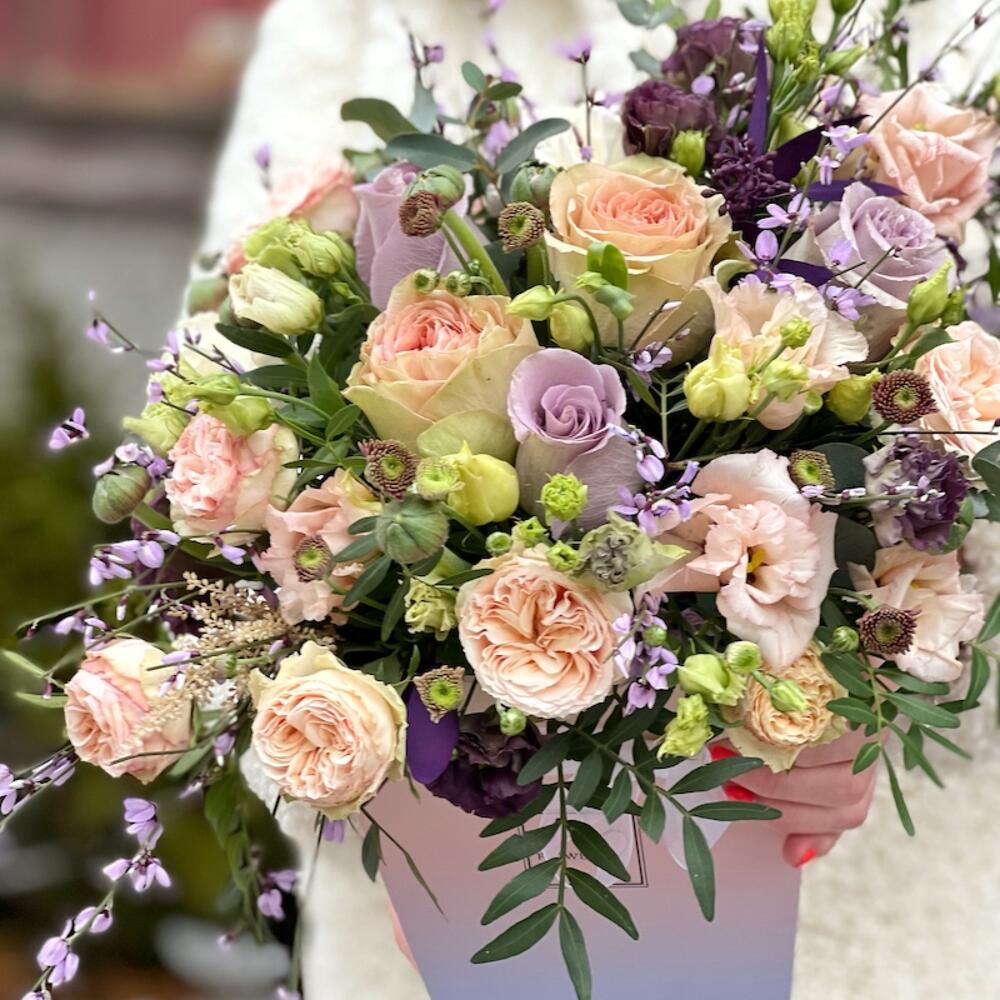 Роза кустовая пионовидная – 3 шт.Роза пионовидная – 2 шт.Роза лавандовая – 4 шт.Лизиантус алиса – 4 шт.Джинстер – 4 шт.Эвкалипт – 4 шт.цветы микс – 4 шт.зелень микс – 4 шт.Коробка – 1 шт.Флористическая губка – 1 шт.Фисташка – 3 шт.Лента – 1 шт.