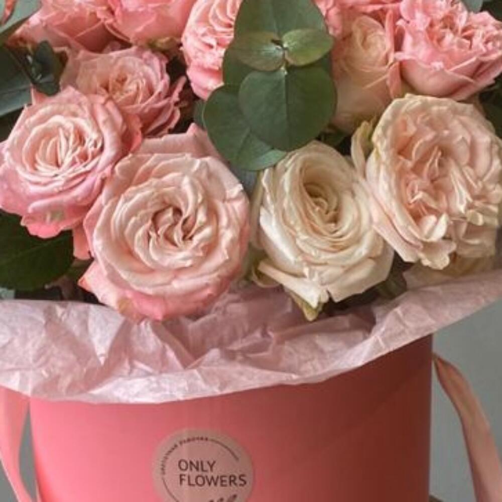 Эвкалипт – 4 шт.Роза пионовидная – 7 шт.Роза кустовая – 5 шт.Тишью – 1 шт.Коробка – 1 шт.Оазис флористический – 2 шт.
