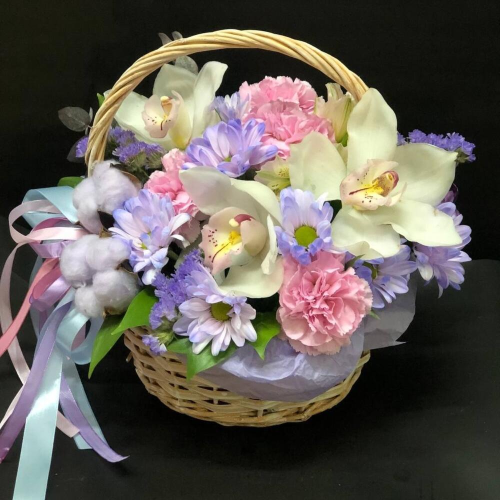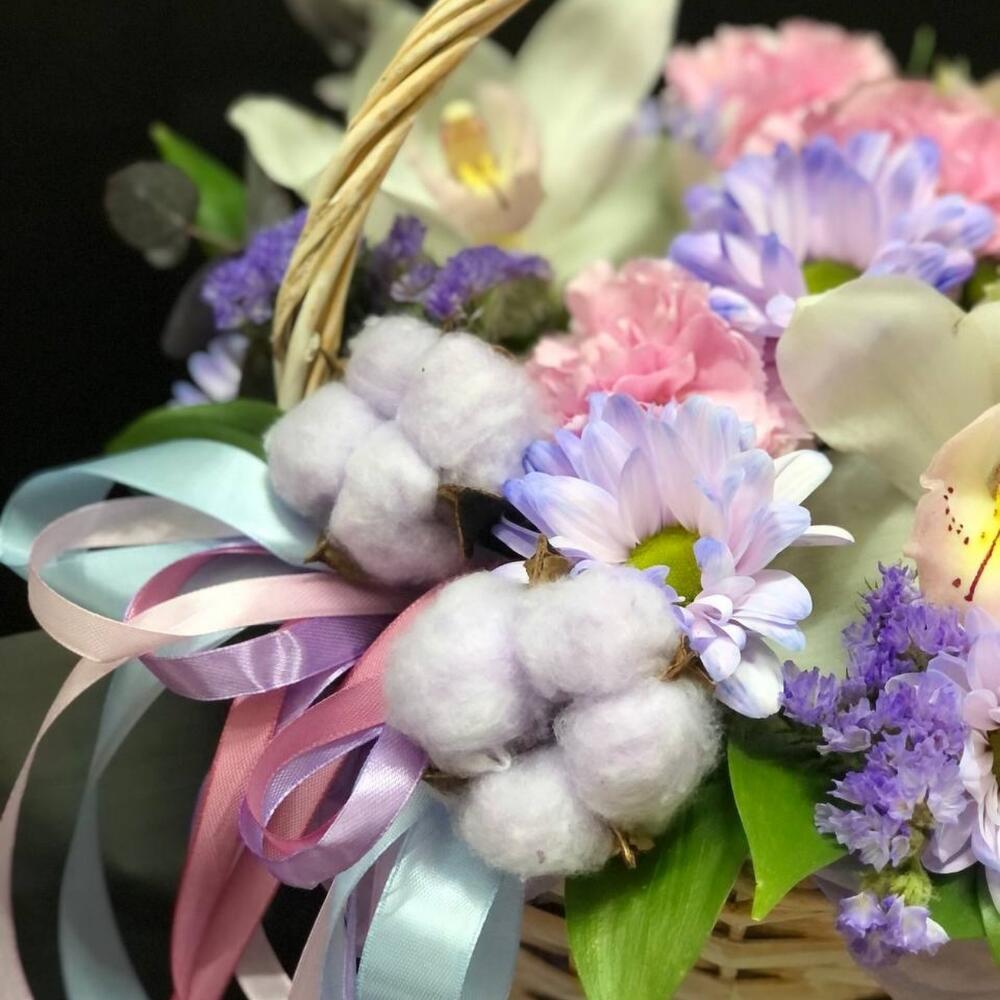 Альстромерия – 1 шт.Цимбидиум белый – 3 шт.Диантус – 4 шт.Рускус – 7 шт.Статица – 1 шт.Тюльпан – 2 шт.Хлопок – 3 шт.Роза – 2 шт.Корзина плетеная – 1 шт.Оазис флористический – 1 шт.Хризантема кустовая – 2 шт.