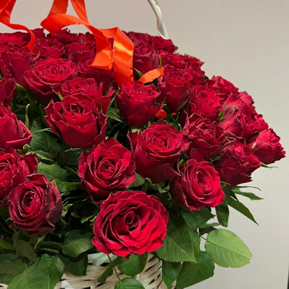 Метки: 101 роза, от 5000 руб, цветы в корзине