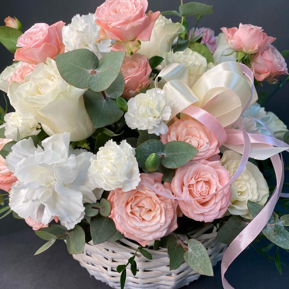 Корзина пион роз, диантуса и эвкалипта «Бал цветов»
