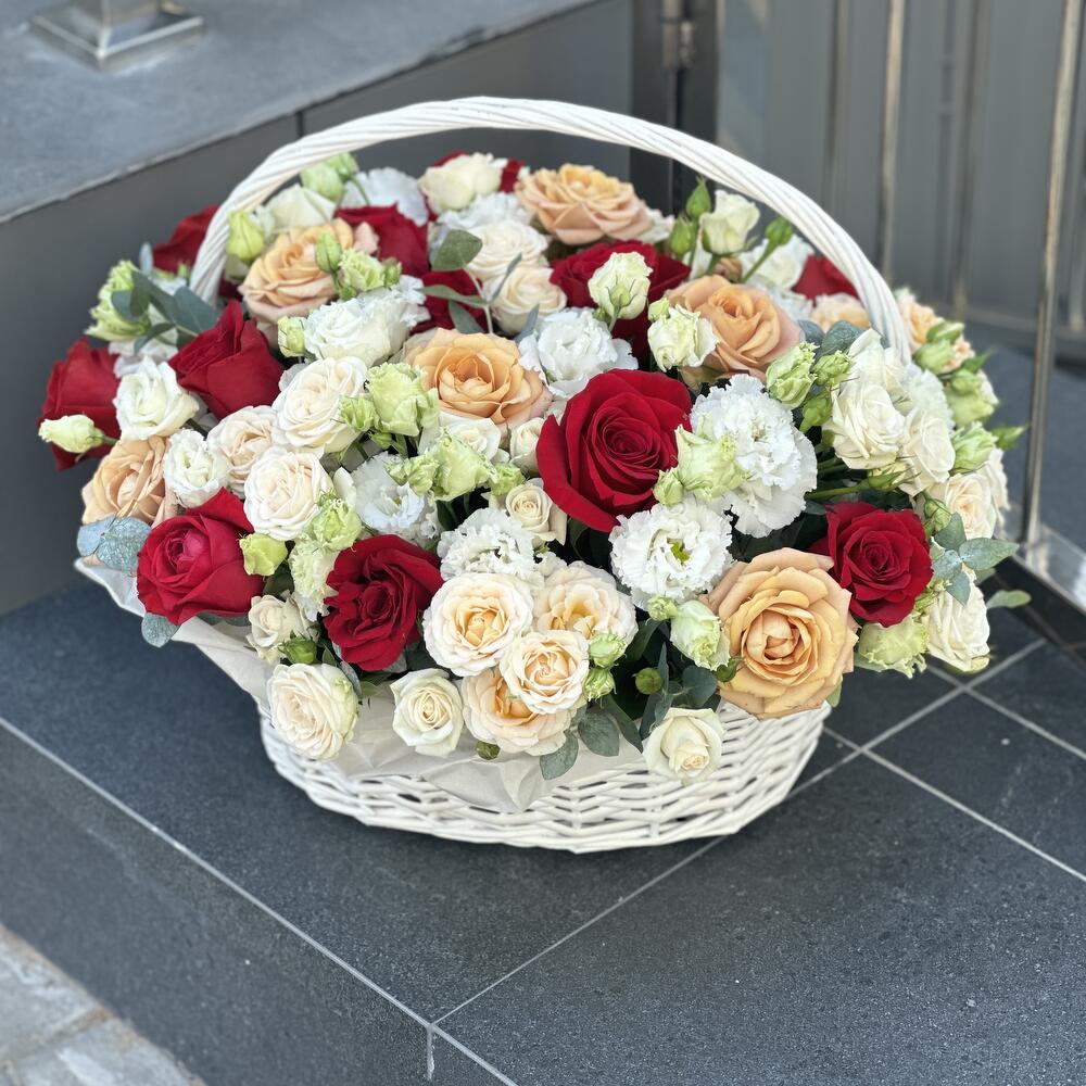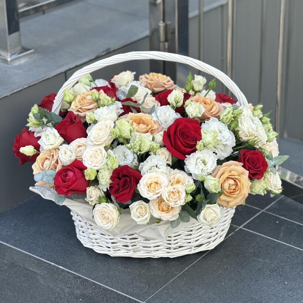 Корзина Прекрасная Иллюзия из роз сорта капучино, фридом, эустомы и кустовых роз