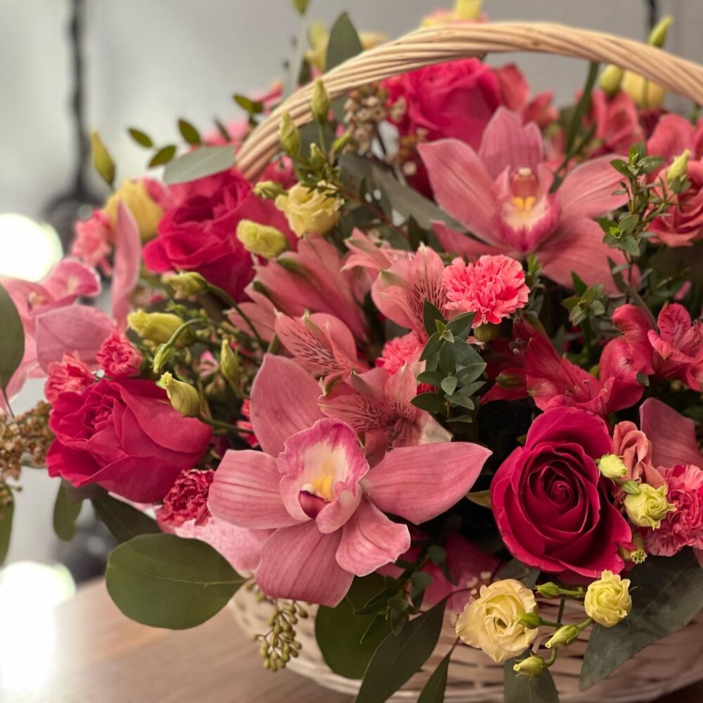 Орхидея цимбидиум бутон – 7 шт.Диантус кустовой – 9 шт.Альстромерия – 7 шт.Роза Эквадор – 7 шт.Эвкалипт Микс – 20 шт.Корзина плетеная – 1 шт.Оазис флористический – 1 шт.Лента атласная – 2 шт.Тишью – 7 шт.работа флориста – 1 шт.