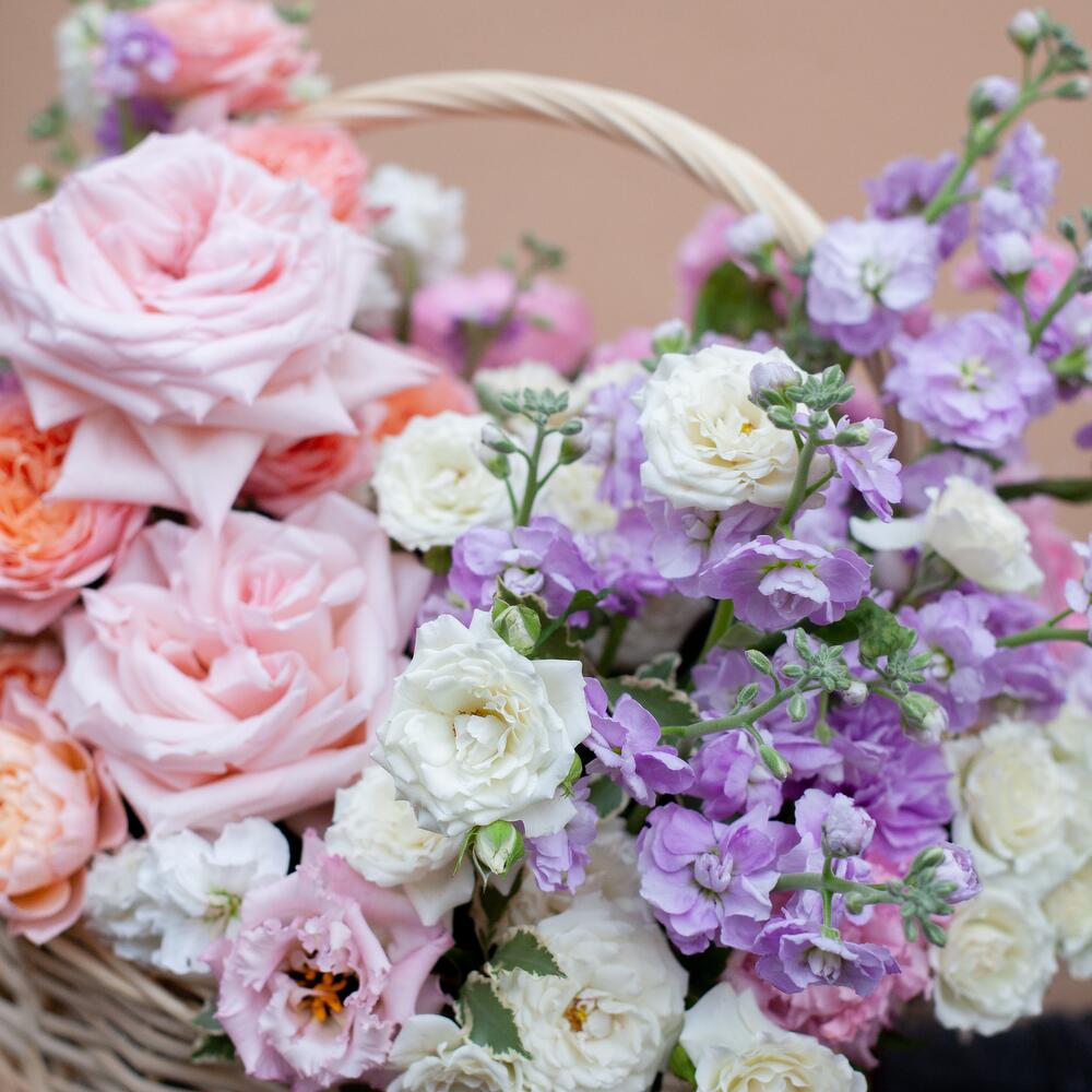Корзина с пионовидными розами, лизиантусом и маттиолой полевой