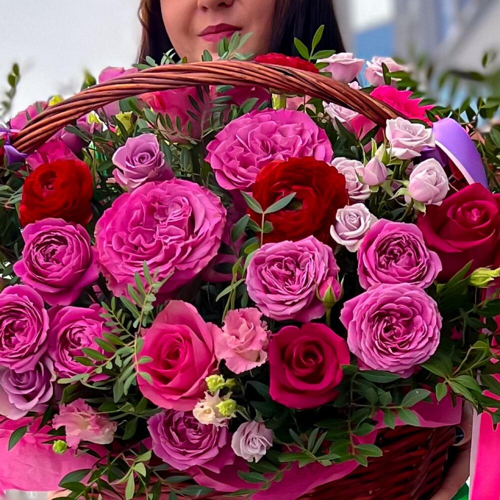 Корзина плетеная – 1 шт.Оазис флористический – 3 шт.ленты атласные – 6 шт.Фисташка – 9 шт.Ранункулюс – 3 шт.Эустома – 5 шт.Роза пионовидная – 5 шт.роза Misty Bubbles пионовидная – 6 шт.Роза кустовая – 4 шт.Роза одноголовая – 15 шт.