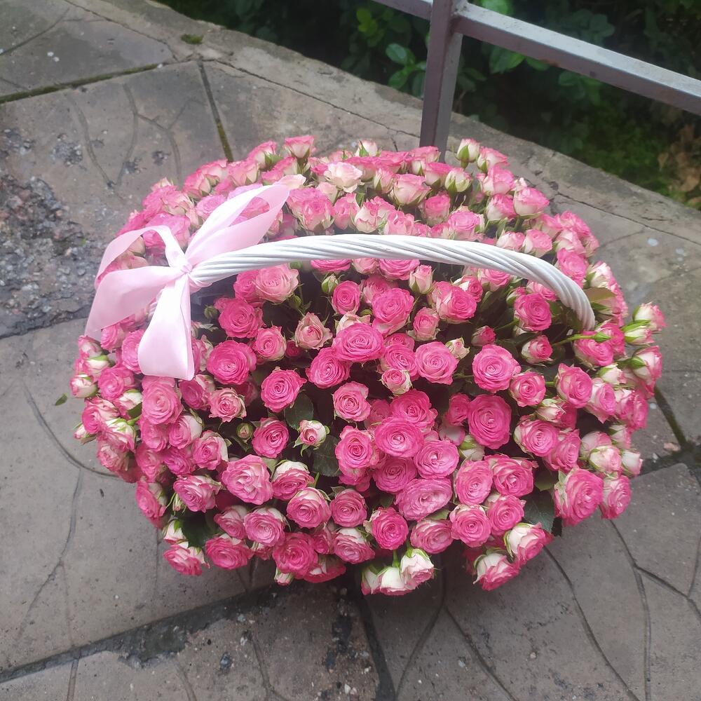 Роза кустовая – 81 шт.Корзина плетеная – 1 шт.Оазис флористический – 2 шт.бант атласный – 1 шт.