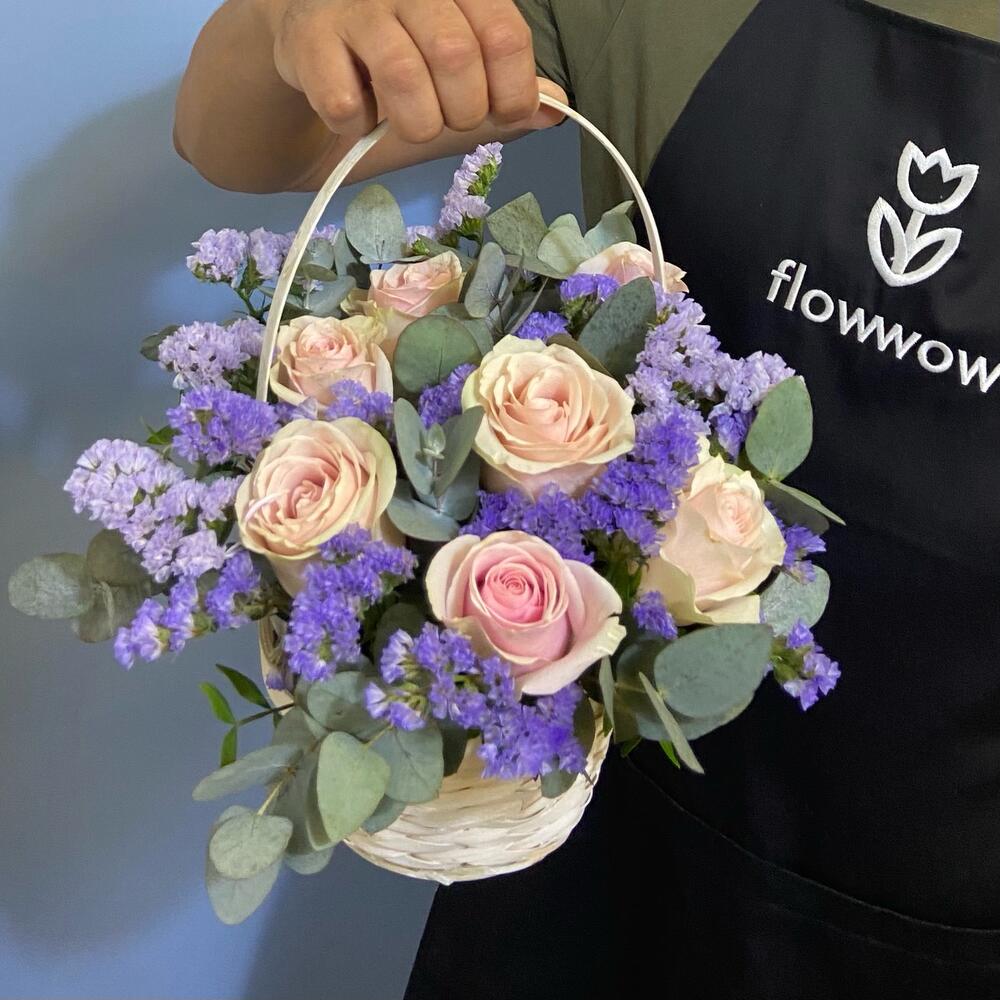 Роза Эквадор Премиум – 7 шт.Статица лавандовая – 3 шт.Эвкалипт – 5 шт.Корзина – 1 шт.