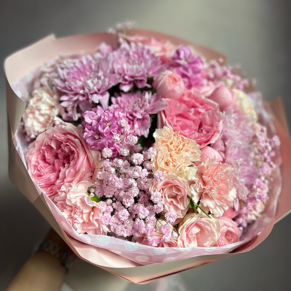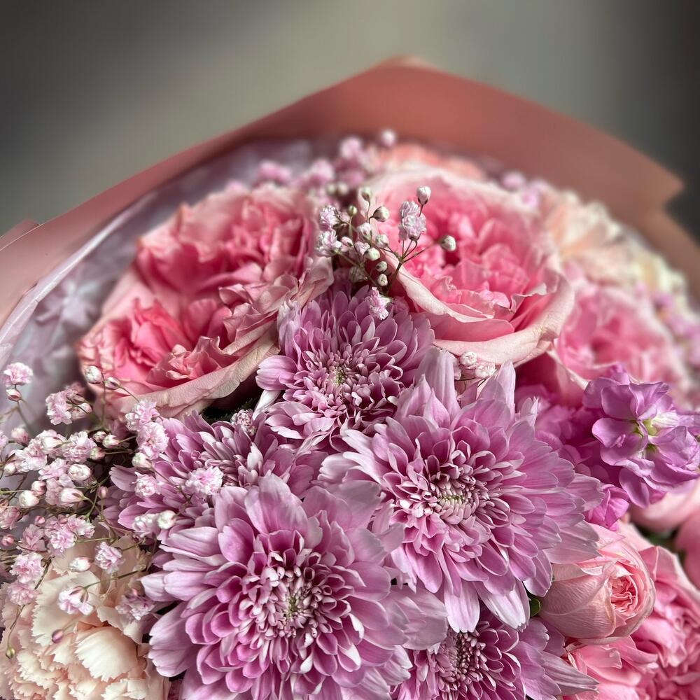 Пионовидная роза – 5 шт.Диантус – 9 шт.Кустовая хризантема – 2 шт.Маттиола – 2 шт.Кустовая роза – 1 шт.Пионовидная кустовая роза – 2 шт.Гипсофила – 1 шт.декоративная упаковка – 1 шт.Атласная лента – 1 шт.