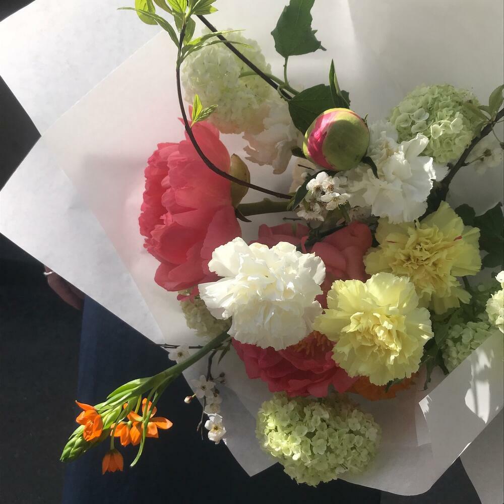 Вибурнум – 2 шт.Пион – 3 шт.Гвоздика – 6 шт.Орнитогалум – 1 шт.Роза садовая – 1 шт.яблоня – 2 шт.краснотал – 2 шт.