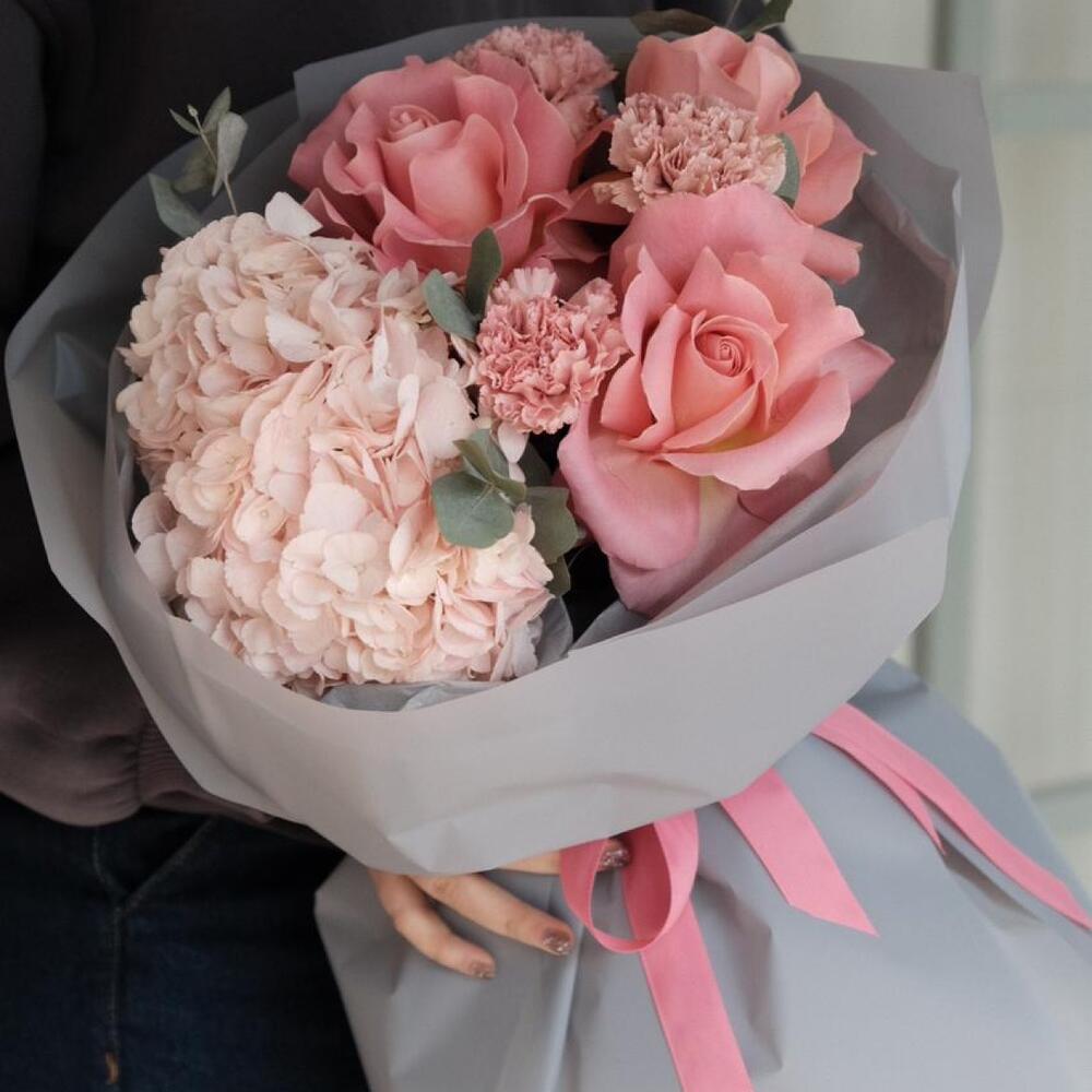 Авторский букет 1. гортензия, пион кустовая роза, роза