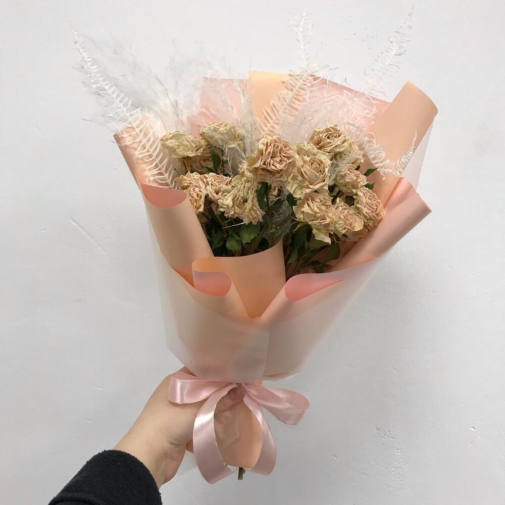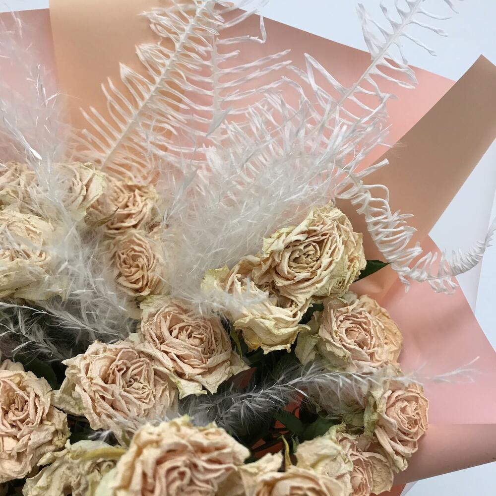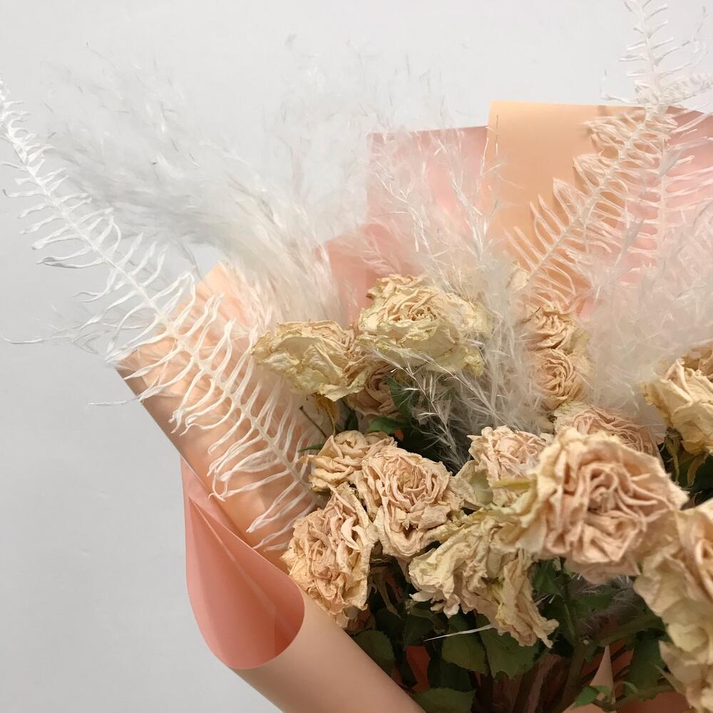 Оформление – 1 шт.Ковыль – 3 шт.аспарагус стабилизированный – 2 шт.засушенная кустовая роза – 7 шт.