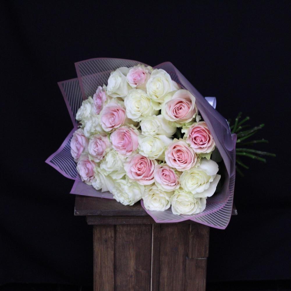 Роза Мондиаль – 13 шт.роза фруттето – 12 шт.Пленка дизайнерская – 2 шт.Лента атласная – 1 шт.