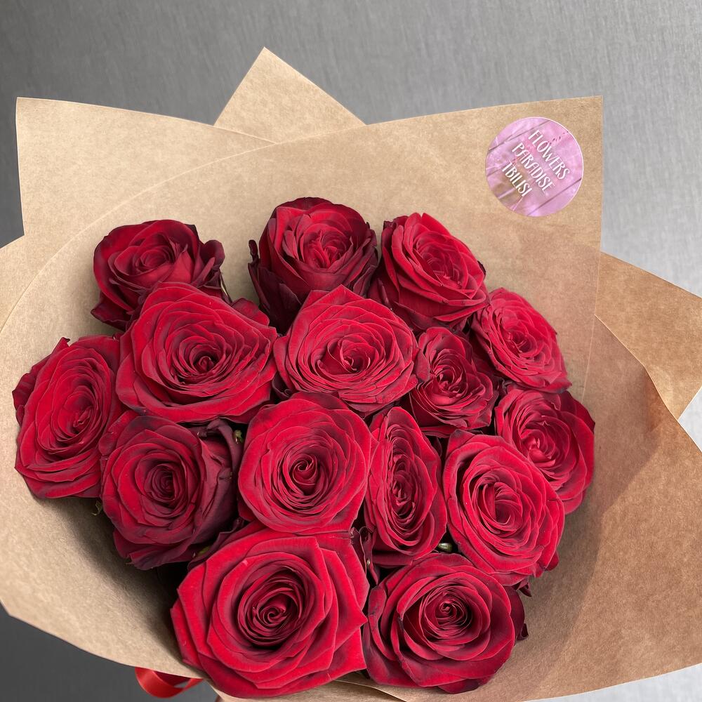 Роза красная – 15 шт. Упаковка – 1 шт. Атласная лента – 1 шт.