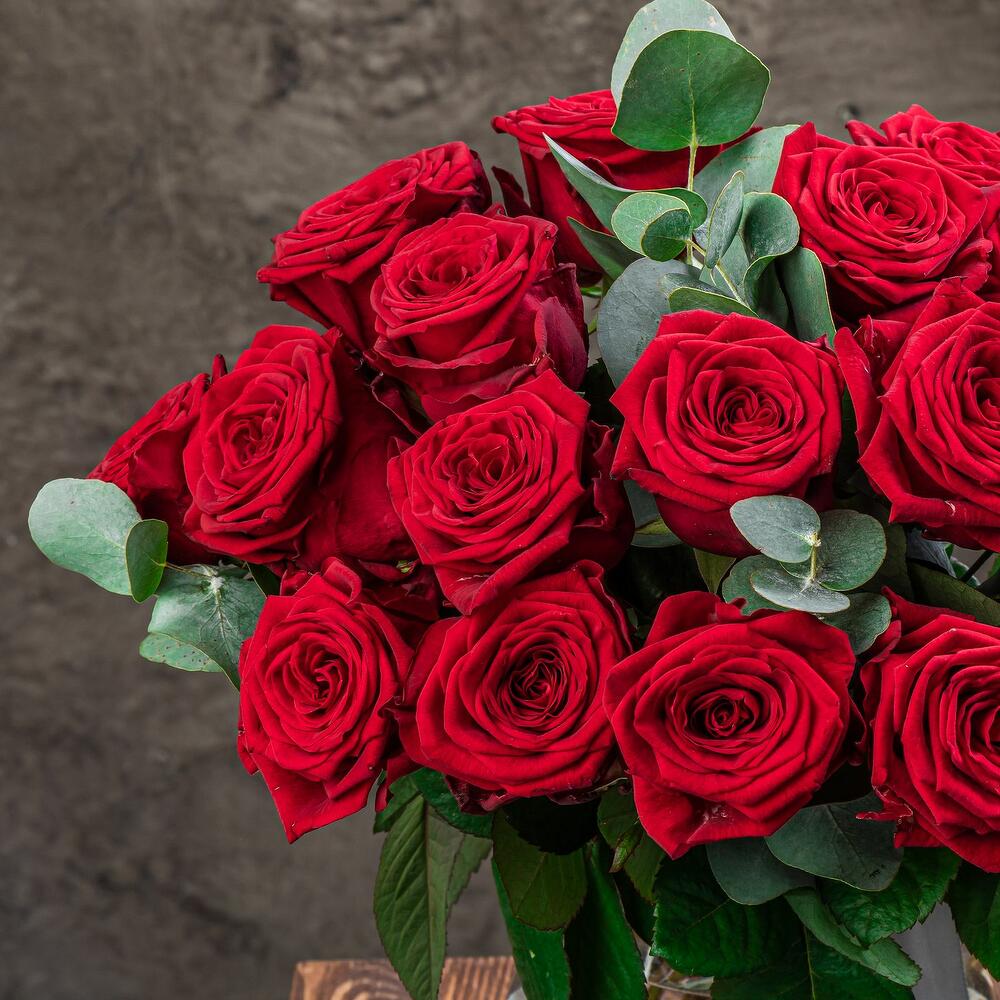 Монобукет в вазе из красных роз с эвкалиптом
