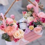 Нежная цветочная композиция в ящике с ароматической свечой
